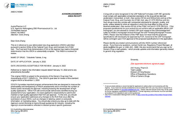 3月16日,珍寶島藥業(yè)發(fā)布公告,公司化藥仿制藥枸櫞酸托法替布片(規(guī)格:5mg)獲得美國食品藥物管理局(以下簡稱“FDA”)下發(fā)的《受理通知書》,待取得FDA注冊批件或上市許可批件后可進行銷售。