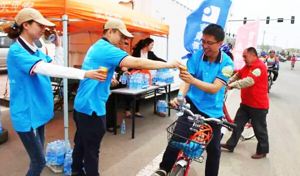 隨著騎行指令的發(fā)出,醫(yī)貿(mào)公司方陣有序進(jìn)入賽道,每一輛自行車上插有帶企業(yè)logo的旗幟,如同一股藍(lán)色的溪流涌入騎行路線。為保障騎行秩序、確保人員安全,特成立后勤小組,現(xiàn)場為運(yùn)動(dòng)員分發(fā)水和食物。